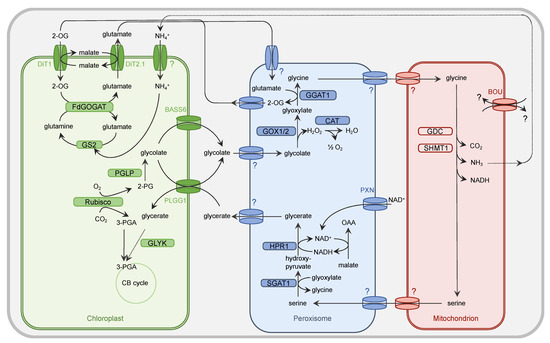 Simplified presentation of the plant PR metabolism. Oxygenation activity of Rubisco within the chloroplast results in the generation of one molecule of 3-PGA and 2-PG each. While 3-PGA is metabolized in the CB cycle, 2-PG is degraded by the PR metabolism. Within the chloroplast, 2-PG is dephosphorylated by 2-PG phosphatase (PGLP). Formed glycolate is exported from the chloroplast by PLGG1 and BASS6 and enters the peroxisome by a yet unidentified (?) translocator. Glycolate oxidase (GOX1/2) generates glyoxylate and H2O2. The latter one is converted by catalase (CAT) activity into O2 and H2O. The PR intermediate glyoxylate is aminated by glutamate:glyoxylate aminotransferase (GGAT1) to yield glycine. Glutamate serves as a donor for the amino group. The peroxisomal importer for this amino acid but also glycine is to date unknown. Glycine needs to be imported by an unknown translocator into the mitochondrion. Here, the concerted action of the multienzyme system glycine decarboxylase (GDC) and serine hydroxymethyltransferase (SHMT) results in release of CO2 and NH3 from one molecule of glycine but also conversion of another molecule of glycine into serine. The substrate(s) of the transporter À BOU DE SOUFFLE (BOU) are unclear. BOU is likely involved in mitochondrial glutamate transport and functionally linked with glycine-to-serine conversion. Export of serine from the mitochondrion is facilitated by an unknown transporter protein. This applies also to the import into the peroxisome. Serine is deaminated by serine:glyoxylate aminotransferase (SGAT1) to form hydroxypyruvate. For the subsequent reduction of this intermediate to glycerate, hydroxypyruvate reductase 1 (HPR1) depends on NADH, which is provided by the oxidation of OAA into malate. NAD+ is basically imported into peroxisome by the peroxisomal NAD carrier PXN. Glycerate leaves the peroxisome by an unknown mechanism and imported into the chloroplast by PLGG1. The concluding step in the PR pathway is the phosphorylation of glycerate and formation of 3-PGA by glycerate kinase (GLYK). 3-PGA enters the CB cycle. The dicarboxylate translocators DiT1 and Dit2.1 function as two-translocator system for the refixation of NH4+ in the chloroplast by the GS/FdGOGAT system. Further details are given in the main body.