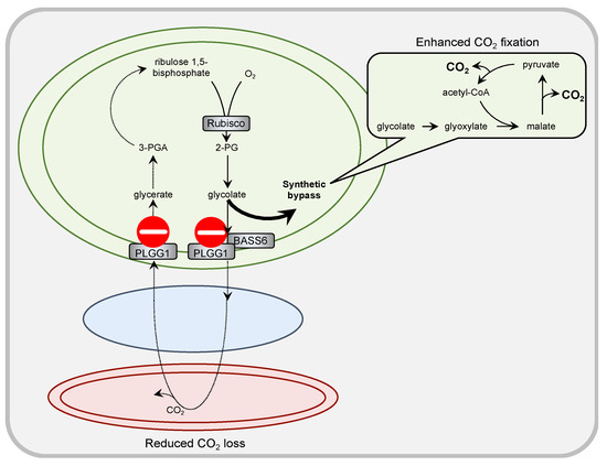 In future attempts, advanced synthetic bypasses will be tested. Those systematically designed bypasses will combine existing and new-to-nature enzymes to ideally function in a carbon-conserving way and boost plant productivity [79]. Like the South bypass, those routes will also take place in the chloroplast only. Thus, the activities of PLGG1 and BASS6 will be a determinator for flux distribution through the native and the synthetic route.
