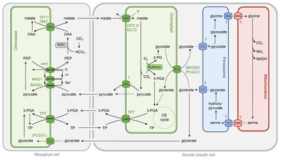 In C4 species, the CB and PR cycles start with Rubisco activity in the bundle sheath. However, the activity of the light reactions and consequently reductive power is higher in the mesophyll cells, especially in the NADP-ME subtype. The reduction steps of the CB cycle from 3-PGA to triose phosphate are therefore localized in the mesophyll. This requires additional metabolite shuttling between the cells and transport of 3-PGA and triose phosphate across plastidial membranes in both cell compartments [109]. In C4 species, the triose phosphate translocator (TPT) is generally transcribed at high levels [105]. In the last step of PR, glycerate kinase catalyzes the production of 3-PGA. In coordination with the CB cycle, this step is also localized in the mesophyll cells. It requires the transport of PR glycerate from bundle sheath to the mesophyll. The PLGG1 translocator exchanges glycolate and glycerate at the plastid membrane [18], but, in the C4 leaf, the transport of both metabolites would be largely uncoupled. In the bundle sheath, BASS6 could contribute to glycolate export [19], but, in the mesophyll plastid, the absence of PR glycolate would limit glycerate uptake by the PLGG1 translocator.