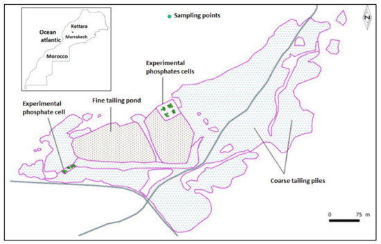 The Kettara mine includes the oldest and most exploited massive sulfides in this metallogenic area. During its 17 years of operation, the mine produced 5.2 Mt (1 Mt = 1 Million metric ton) of pyrrhotite concentrate, which contains on average 29% of sulfide [42]. Thanks to its role in the production of sulfuric acid and therefore in the development of the phosphate industry in Morocco, the mine has become one of the most important sites in Morocco’s 20th century mining industry history. More than 3 Mt of sulfide mine tailings, mainly rich in pyrrhotite, pyrite, arsenopyrite, chalcopyrite, galena and sphalerite, have been deposited over an area of approximately 16 ha. The mining tailings pond is surrounded by abandoned waste rocks which is mainly in the form of a dyke, the height of which is approximately 15 m. We also note the presence on the site, during dry periods, of precipitates of secondary minerals [4,5].