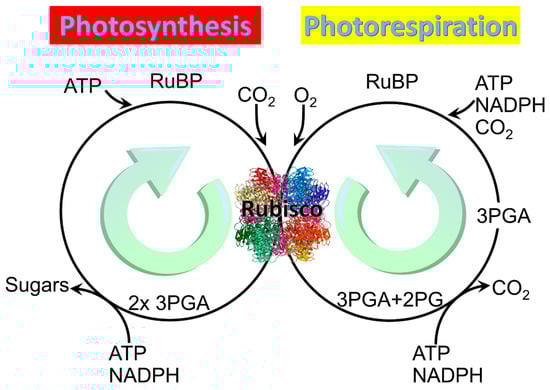 Photorespiration involves the oxygenation of ribulose-1,5-bisphosphate (RuBP) to form 3-phosphoglycerate (3PGA) and 2-phosphoglycolate (2PG) and the subsequent carbon oxidation pathways that release CO2 under light conditions [1,2,3,4,5]. Because it produces 2PG, a compound “toxic” to many enzymes in photosynthetic metabolism, and oxidizes organic carbon without seemingly generating ATP, photorespiration is generally considered a wasteful process. The following sections examines how the photorespiratory pathway converts 2PG into glycolate, the only carbon source for the photosynthetic carbon oxidation cycle [6], a cycle that together with nitrogen assimilation, C1 metabolism, and sulfur assimilation generates essential amino acids and intermediate compounds [7]. Moreover, the three enzymes involved in the initial photorespiratory steps within chloroplasts—Rubisco, malic enzyme, and phosphoglycolate phosphatase—have metal binding sites that accommodate either Mg2+ or Mn2+, and balance between the binding of these enzymes to Mg2+ or Mn2+ may shift the relative rates and energy efficiencies of photosynthesis and photorespiration [8].
