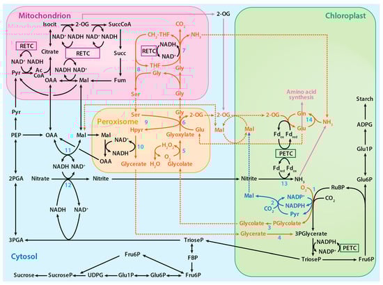 One physiological mechanism that may be responsible for the interdependency of photorespiration and shoot NO3– assimilation involves the reduction of the Mn2+-RuBP complex during oxidation of RuBP. This increases the redox potential of the chloroplast [101], thereby stimulating the production of malate [122,123] and promoting its export from chloroplasts to the cytoplasm. Malate dehydrogenase in the cytoplasm converts malate to oxaloacetate, generating NADH [124,125,126] to empower the initial step of NO3− assimilation [127]. Consequently, mutations that alter malate transport or metabolism influence both photorespiration and NO3− assimilation [122,128,129].