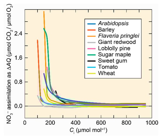 Shoot NO3– assimilation as a function of shoot internal CO2 concentration (Ci) for 9 C3 species. Adapted with permission from ref. [101]. Copyright 2014 Springer Science Business Media Dordrecht.