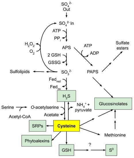 An outline of sulfur assimilation and its role in producing sulfur-containing defense compounds. Adapted with permission from ref. [137]. Copyright 2005 Elsevier Ltd.