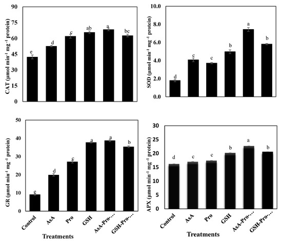 In the present experiment, plants treated with AsA-Pro-GSH and GSH treatments had significantly the highest concentrations of non-enzymatic antioxidants such as GSH. AsA concentration in the plants was the highest with AsA-Pro-GSH treatment (Figure 2). These results are in agreement with those reported by [23] on cucumber plants grown under cadmium stress conditions. In salinized maize plants, AsA concentrations were the highest with AsA-Pro-GSH treatment, whereas GSH concentration was the highest with both GSH-Pro-AsA and AsA-Pro-GSH treatments [94]. In our experiment, Pro concentration was the highest with Pro treatment (Figure 2). This is contrary to results by [94], where salinized maize plants had the highest Pro concentration with AsA-Pro-GSH treatment.