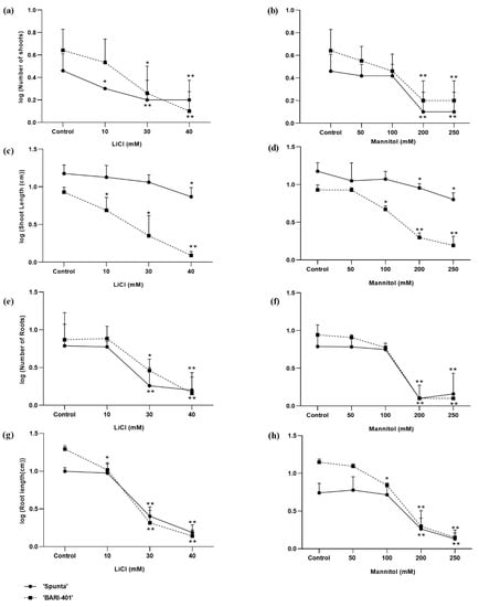 Log transformed growth parameters for BARI-401 and Spunta treated with LiCl (10, 30, and 40 mM) and mannitol (50, 100, 200, and 250 mM). (a,b): Number of shoots; (c,d): Shoot length (cm); (e,f): Number of roots; (g,h): Root length (cm). Significance between treatments and control (plantlets grown without additional LiCl or Mannitol) indicated by * (p < 0.05) and ** (p < 0.01) as determined by ANOVA with LSD.