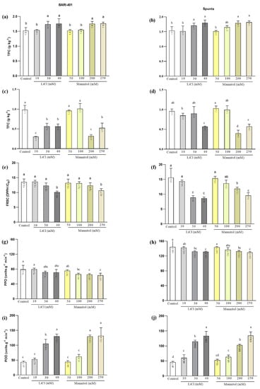 Biochemical parameters of BARI-401 and Spunta when treated with LiCl (10, 30, and 40 mM) and mannitol (50, 100, 200, and 250 mM). (a,b): total phenols concentration (TPC); (c,d): total flavonoids concentration: (e,f): free-radical scavenging capacity (FRSC); (g,h): polyphenol oxidase (PPO) specific activity; (i,j): peroxidase (POD) specific activity. Significance between treatments and control (plantlets grown without additional LiCl or Mannitol) indicated by letters, means followed by the same letter are not significantly different at (p < 0.05) as determined by ANOVA with LSD.