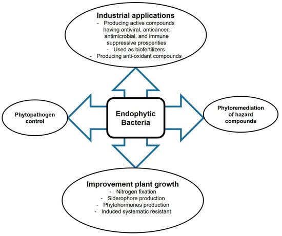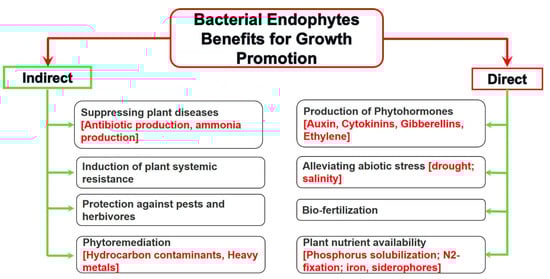 Endophytic bacteria utilize the same mechanisms as rhizosphere bacteria for enhancing plant growth in silviculture, horticulture, and agriculture, as well as in phytoremediation [59]. The growth-promoting effect can be either direct or indirect (Figure 3).