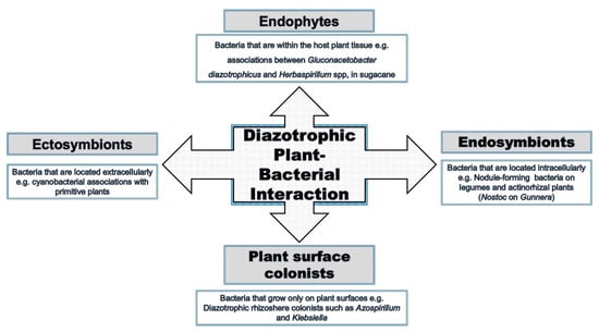 Manufacturing nitrogenous fertilizers is costly, and their usage increases the pollution of groundwater with nitrate [90]. Interestingly, biological nitrogen fixation (BNF) accounts for about two-thirds of the globally fixed nitrogen [91]. Apart from photosynthesis, biological nitrogen fixation (BNF) is the most remarkable biological process, and this process is limited to prokaryotic organisms only. Bacterial endophytes can establish closed relations with certain crops. The plant endosphere contains excess carbon and a lack of oxygen, which presents suitable conditions for nitrogen fixation that can be then transported by endophytes to their host plant. Interestingly, endophytic bacteria can fix nitrogen within plants without forming nodule-like structures [92]. Some endophytic bacteria possess BNF genes that enable them to convert nitrogen gas (N2) to other nitrogen forms such as nitrate and ammonium, which can be utilized by host plants [93,94]. In Brazil, it was observed that sugarcane plant (Saccharum officinarum L) cultivated without nitrogen fertilizers and infected with diazotrophic endophytes such as Herbaspirillum seropedicae and Acetobacter diazotrophicus were able to derive all their nitrogenous needs from atmospheric N2 [95]. Regarding nitrogen fixation, endophytes do better than rhizosphere microbes in promoting plant growth and health, and help the plant thrive in nitrogen-restricted soil [96].