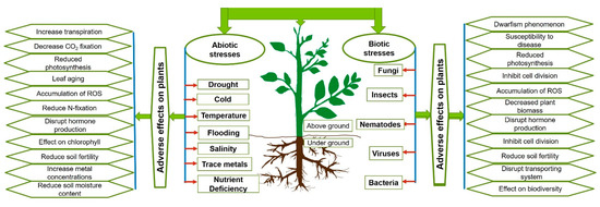 Plants are exposed to various stresses [143], which are the result of antagonistic or toxic substances in their environment, nutrient or essential ion limitations, or biotic stress inducers [144]. Both biotic and abiotic stresses contribute about 30–50% of the agricultural loss worldwide [145]. Temperature, salinity, drought, trace metals, flooding, and nutrient deficiency are considered the major abiotic stresses (Figure 5). Biotic stresses are induced by pathogenic microorganisms up to insects or nematodes. Therefore, future studies aim to develop eco-friendly technologies which increase plants’ resistance to both abiotic and biotic stresses. A promising strategy is the generation of stronger and healthier plants with an improved immune system. Not surprisingly, endophytes have long been known to fulfill these criteria and provide excellent systems for agricultural application, as well as the identification of the molecular mechanisms by which they promote plant fitness. The microbial strategies range from the immediate activation of responsive systems which directly and specifically counteract the stress [146] and the production of anti-stress metabolites [147] that strengthens the plants, to a broad spectrum of immune responses which ultimately protect the plants better when exposed to different stresses. Understanding the mechanism behind these strategies may provide us with molecular and biochemical tools for agricultural applications.