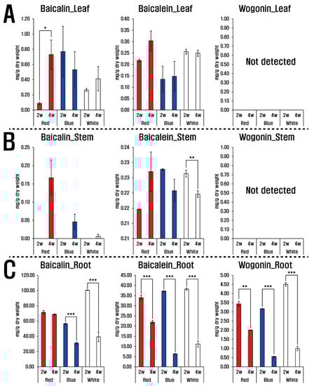 Flavone contents of the leaf (A), stem (B), and root (C) of S. baicalensis seedlings grown under LED treatment of varying duration. 2 w and 4 w indicate 2 weeks and 4 weeks, respectively (t-test, * p < 0.05, ** p < 0.01, *** p < 0.005).