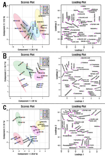 (A) Scores and loading plots of the PCA model using metabolites from the leaves of S. baicalensis seedlings grown under the LED treatment of varying duration, (B) Scores and loading plots of the PCA model using metabolites from the stem of S. baicalensis seedlings grown under the LED treatment of varying duration, and (C) Scores and loading plots of the PCA model using metabolites from the root of S. baicalensis seedlings grown under the LED treatment of varying duration. 2 w and 4 w indicate 2 weeks and 4 weeks, respectively, as well as B, R, and W indicate blue, red, and white, respectively.