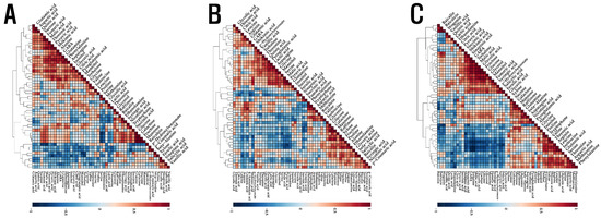 Correlation matrix (A) of metabolites obtained from the leaf of S. baicalensis seedlings grown under the LED treatment of varying duration, correlation matrix (B) of metabolites obtained from the stem of S. baicalensis seedlings grown under the LED treatment of varying duration, and correlation matrix (C) of metabolites obtained from the root of S. baicalensis seedlings grown under the LED treatment of varying duration. Each square indicates the Pearson’s correlation coefficient for a pair of compounds, and the value of the correlation coefficient is represented by the intensity of the deep blue or deep red color, as indicated on the color scale.