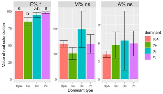 The mycorrhizal parameters (Mean ± SE) in the root system of Poa compressa in the vegetation patches dominated by Pc—Poa compressa, Ce—Calamagrostis epigejos, Dc—Daucus carota, and BpA—Betula pendula tree individuals. Results of ANOVA: ns—non-significant, * p < 0.05. The various letters above bars denote the significance of differences at p < 0.05 after LSD test.