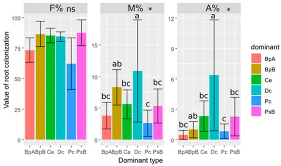 The mycorrhizal parameters (Mean ± SE) in the root system of Calamagrostis epigejos in the vegetation patches dominated by Pc—Poa compressa, Ce—Calamagrostis epigejos, Dc—Daucus carota, BpB—Betula pendula shrub, BpA—Betula pendula tree, and PsB—Pinus sylvestris shrub. Results of ANOVA: ns—non-significant, * p < 0.05. The various letters above bars denote significance of differences at p < 0.05 after LSD test.