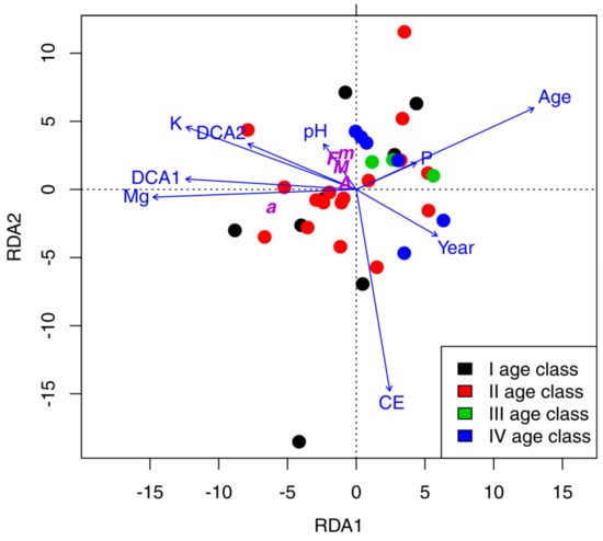 Tri-plot of RDA based on mycorrhizal parameters showing samples in four classes of age (1–4) and environmental factors.