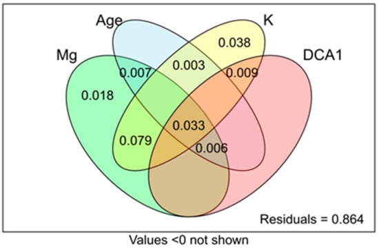 The highest adjR2 was found for K (0.15), followed by Mg (0.13). The age of heap and DCA1 (vegetation gradient) were less important, scoring only 0.019 and 0.012 of adjR2 values, respectively.