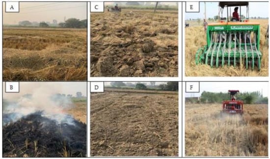 Photograph from fields showing (A) residue (loose and standing) after combine harvesting of rice crop, (B) residue burning, (C) residue incorporation with moldboard plough, (D) residue incorporation with moldboard plough and rotavator, (E) residue incorporation with superseeder, and (F) residue retained on soil surface as mulch.