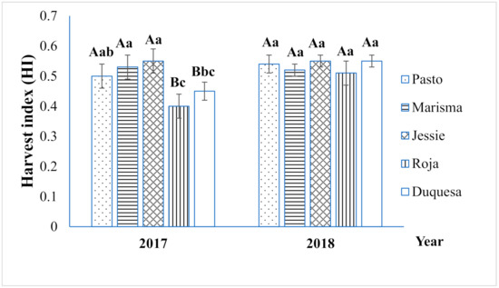Harvest index (HI) of five quinoa varieties during the two years (2017 and 2018) of field experiments. Error bars represent the standard deviation (SD). Different uppercase letters in the same variety indicate a significant difference between years according to Student’s t-test at p < 0.05. In each year, different lowercase letters indicate significant differences among varieties according to Tukey’s test at p < 0.05.