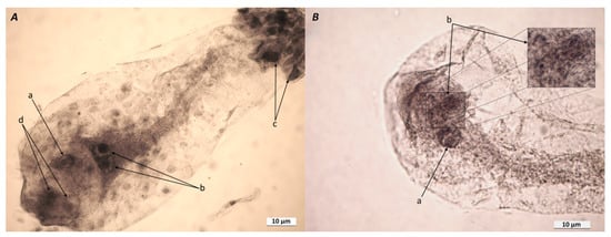 The isolated ESs were stained with a glycerol–acetocarmine solution, as described by Volokhina et al. [33]. The ESs were analyzed with a DM2500 light fluorescence microscope (Leica Microsystems, Wetzlar, Heese, Germany) at the Simbioz Center for the Collective Use of Research Equipment in the Field of Physical–Chemical Biology and Nanobiotechnology (Institute of Biochemistry and Physiology of Plants and Microorganisms, Russian Academy of Sciences, Saratov).