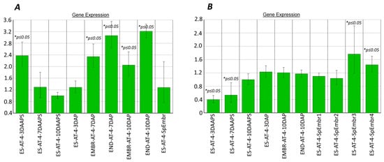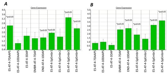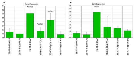 Expression of DNA-methylation genes in the parthenogenic proembryos (10 DAAPS), ESs (7 and 10 DAAPS), and embryos and endosperm (7 and 10 DAP) of the AT-4 line. (А) dmt103; (B) dmt105. Control: unpollinated ESs (10 DAAPS). * Significant differences between target tissue and control cells (ESs at 10 DAAPS) are expressed as p ≤ 0.05. ES-AT-4-SpEmbr1-4: in one biological experiment, each of the four samples consisted of five ESs with parthenogenic proembryos. Data are presented from two independent biological experiments. ES-AT-4-7-10 DAAPS: in one biological experiment, each sample consisted of 12 unpollinated ESs. Data are presented from two independent biological experiments.