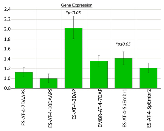 In parthenogenic proembryo 1 (10 DAAPS), the chr106 gene was 1.4 times more expressed (p ≤ 0.05) than it was expressed in unpollinated ESs at 10 DAAPS. chr106 expression in sample 1 with proembryos was similar to that in embryos from pollinated ESs (7 DAP; Figure 3). We did not find any significant differences in chr106 expression between unpollinated ESs (7 and 10 DAAPS) and ESs with parthenogenic proembryos (sample 2) (Figure 3). In pollinated ESs (3 DAP), the chr106 gene was two times more expressed (p ≤ 0.05) than it was expressed in unpollinated ESs at 10 DAAPS.