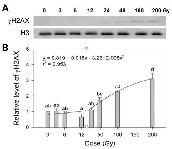 Induction of the γH2AX protein in rice irradiated with different doses of gamma radiation. The representative images (A) were obtained by Western blot analysis and subjected to regression for the quadratic dose–response curve (B). H3 was used as a loading control. Data are reported as the mean ± standard error (SE) of three independent experiments. Different letters indicate significant differences at p < 0.05 (one-way analysis of variance followed by Tukey’s honestly significant difference test).