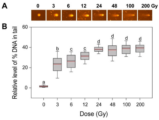 DNA damage in rice irradiated with different doses of gamma radiation. The representative images (A) were obtained by an alkaline comet assay and subjected to calculation for the ‘% DNA in tail’ (B) by Komet 5.5 image analysis software (Kinetic Imaging, Ltd., Liverpool, UK). The box plots extend from the 25th to the 75th percentiles, with black and red horizontal lines at the median (50th percentile) and the mean values, respectively. Error bars indicate the 90th and 10th percentiles. Data show the distribution of 80~160 nuclei from three independent experiments. Different letters indicate significant differences at p < 0.05 (one-way analysis of variance followed by Tukey’s honestly significant difference test).
