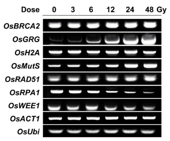 Transcription levels of gamma-ray-responsive genes in rice irradiated with different doses of gamma radiation. OsBRCA2, OsGRG, OsH2A, OsMutS, OsRAD51, OsRPA1, and OsWEE1 were selected as gamma ray-responsive genes from our previous study [18]. Seedlings were irradiated with gamma radiation for 1 h at a dose rate of 3, 6, 12, 24, or 48 Gy h−1, and then they were subjected to the reverse transcription polymerase chain reaction (PCR) assay as described in the Materials and Method section. OsACT1 and OsUbi were used as endogenous control genes.
