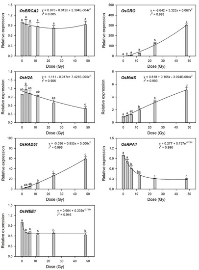 Relative transcription levels of the selected gamma-ray-responsive genes and dose–response curves after irradiation as measured by quantitative real-time polymerase chain reaction (RT-qPCR). All transcription levels are shown relative to the 0 Gy group of Dongjin-byeo seedlings. Data are the mean ± SE with n = 9 from three independent experiments. Different letters indicate significant differences at p < 0.05 (one-way analysis of variance followed by Tukey’s honestly significant difference test).