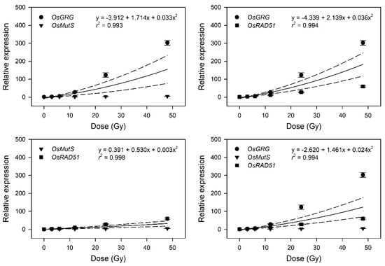 Dose–response curves pooled from the relative transcription levels of three selected gamma-ray-responsive genes. The dose–response curves of OsGRG, OsMutS, and OsRAD51 were integrated as a linear-quadratic equation. The solid line is the linear regression fitted line with r2 values, and the dashed lines show the upper and lower 95% confidence intervals.