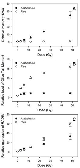 Since DSBs are the most deleterious type of DNA damage but are rapidly recoverable by homologous recombination (HR) or non-homologous end-joining, they can be substantially detectable only within 1 h after irradiation [24,25,26]. The alkaline comet assay method measures various DNA damages including frank strand breaks, incomplete excision repair sites, alkali-labile sites, and crosslinking, while the neutral method mainly detects DSBs [8,26,27]. Therefore, we performed an alkaline comet assay to investigate the dose–response of the gamma-ray-induced DNA damages in rice. The ‘% DNA in tail’ increased somewhat dose-dependently up to 24 Gy, but it remained constant in the range of 24 to 200 Gy (Figure 2). When compared with the more limited dose-dependency of the ‘% DNA in tail’ below 6 Gy in Arabidopsis [4], the dose–response of the ‘% DNA in tail’ in rice appeared greater than that of γH2AX below 24 Gy. However, the relatively low confidence of the γH2AX assay with no γH2AX signal below 24 Gy and the saturated ‘% DNA in tail’ signal above 24 Gy in the alkaline comet assay demonstrated that DNA damage-based conventional methods such as γH2AX and comet assays may be not appropriate for phytodosimetry in rice. Moreover, the conventional models for phytodosimetry of gamma radiation showed a substantial difference in the DDR between the monocot rice and the dicot Arabidopsis. The difference in the DDR between rice and Arabidopsis may be associated with the differential expression of some DDR genes such as RPA1, BRCA1, and CYCB1;1 after gamma irradiation as previously reported [18].
