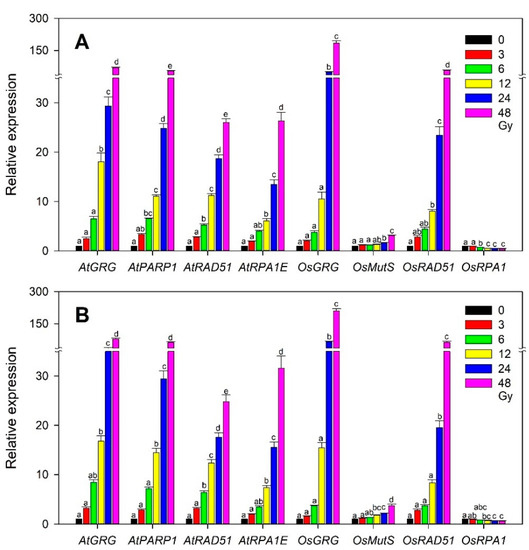 Difference in the dose-dependent transcription of the selected rice and Arabidopsis gamma-ray-responsive genes at two developmental stages or seedling ages after sowing. (A,B) represent 10- and 20-day-old seedlings, respectively. All transcription levels are shown relative to the 0 Gy group. Data are the mean ± SE with n = 9 from three independent experiments. Different letters indicate significant differences at p < 0.05 (one-way analysis of variance followed by Tukey’s honestly significant difference test).