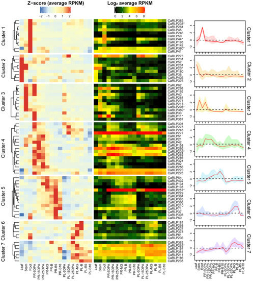 The RLP gene family is one of the largest super families involved in various biological functions in plants, yet only a few RLP genes have been functionally characterized regarding biological processes. The RNA-seq has been widely applied to research including the analysis of gene expression and prediction of gene function since next-generation sequencing has been easily available to use. Several studies have reported the genome-wide identification of RLP genes in Arabidopsis, rice, tomato, Brassica, and legumes [24,29,30,31,32,33]. However, no previous study has reported the genome-wide transcriptional profiles in organ-specific of RLPs in pepper. Previously, we identified 438 pepper RLP genes and a comparative transcriptomic analysis revealed the role of core RLP regulators in disease resistance against various pathogens [26]. In the study reported here, we attempted to discover the additional function involved in plant growth by analyzing pepper tissue-specific transcriptome. A total of 76 CaRLPs had variable expression patterns whereby some were expressed evenly in all stages tested or specifically in one or a few stages (Supplementary Table S1). The hierarchical clustering of 76 CaRLPs was detected via categorization into seven clusters showing distinct tissue-specific expression patterns. Among them, ten CaRLP genes having specific sequences and distinguishable expressions were selected for further analysis.