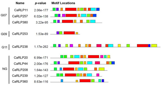 In a previous study, 10 selected CaRLPs were assigned to different pepper RLP groups (Table 1) [26]. Five of the genes were designated as the none-group, three genes constituted Group 07 (G07), one gene was assigned to Group 09 (G09), and one gene was put in Group 11 (G11), which contained the characterized RLP called CLAVATA2 (CLV2). To determine the structure similarities of RLPs, we conducted conserved motifs analyses with 10 CaRLPs. The motif analyses revealed that the 10 CaRLPs had various motif formations according to their group (Figure 2). As predicted, CaRLP11, 257, and 380 in G07 had similar motifs to one other, and there was low similarity of motif composition in the non-group to which five genes belonged.