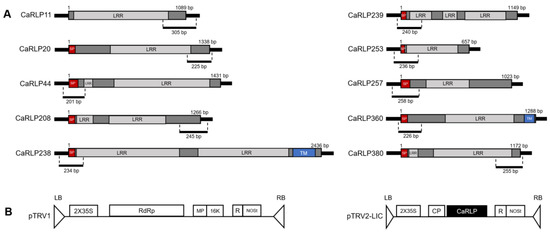 RLP (receptor-like protein) structure and schematic diagram of silenced region of each CaRLP (Capsicum annuum receptor-like proteins) and TRV (Tobacco rattle virus)-based VIGS (virus-induced gene silencing) vector. (A) RLP structure with the diagram of silencing region of CaRLPs. Partial fragment of the gene used for silencing are shown below full CDS (coding sequence) region of each CaRLP. LRR, leucine rich repeat; SP, signal peptide; TM, transmembrane domain. Dark gray region without domain name in CDS indicates non-LRR region. (B) Map of the TRV-based VIGS vector used in this study. Partial fragments of each CaRLP were cloned into black colored region (named “CaRLP”) of pTRV2-LIC. LB, left borders of the T-DNA; RB, right borders of the T-DNA; 2X35S, two copies of the Cauliflower mosaic virus 35S promoter; CP, coat protein; RdRp, RNA-dependent RNA polymerase; MP, movement protein; 16 K, 16 Kda protein; R, self-cleaving ribozyme; NOSt, nos-terminator.