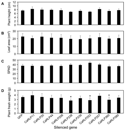 Phenotype analysis of 10 CaRLP (Capsicum annuum receptor-like proteins)-silenced pepper plants. Comparison of plant height (A), leaf area (B), chlorophyll contents (C), and fresh weight (D) in control plants (GFP; green fluorescent protein) and CaRLP-silenced plants. CaRLP-silenced plants and control plants were used for phenotypic analysis at six weeks after silencing. The plant height was measured from the ground to the growth point of the shoot. The plant fresh weight included shoot and root weight. The leaf area and chlorophyll contents were measured on the third true leaf and third and fourth leaves, respectively. Data are shown as mean ± SD. Statistically significant differences compared with the TRV2-GFP control determined using Student’s t-test are indicated by asterisks (* p < 0.05).