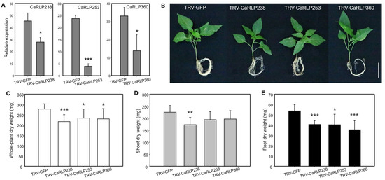 To further understand a possible function, we observed the silencing effects of three CaRLPs (CaRLP238, CaRLP253, and CaRLP360) in the growth of shoots and roots. The expression level of each of the three CaRLPs, determined using semi-quantitative RT-PCR, was significantly lower in CaRLP-silenced plants than in the TRV2-GFP control plants (Figure 5a). Slight phenotypic alterations among the three CaRLP-silenced plants and TRV-GFP plants were observed. (Figure 5b). Even though significant differences were not detected in the plant height of CaRLP-silenced plants compared with control plants (Figure 3a), the growth of plant shoots in CaRLP-silenced plants was smaller than that of control plants (Figure 5b). The root phenotype of three CaRLP-silenced plants showed inhibition of root growth compared with control plants. In addition, we measured the dry weight of the whole plant, shoot, and root in three CaRLP-silenced plants and control plants. The whole-plant dry weight was significantly reduced in all three CaRLP-silenced plants compared to controls (Figure 5c). Interestingly, only CaRLP238-silenced plants had significantly decreased shoot dry weight compared with controls (Figure 5d). Root dry weights of all three CaRLP-silenced plants were significantly reduced compared to controls. Taken together, suppression of three genes resulted in retardation of shoot and/or root growth, suggesting that these genes may be involved in regulation of plant normal growth.