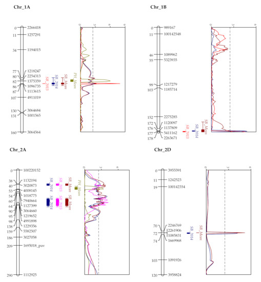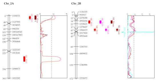 In both populations, QTLs on the group 2 homeologous chromosomes differed significantly among the resistant and susceptible bulks. Among these DSRB QTLs, the 2A QTL on WC seems to be linked with SSR marker Xgwm425 which had been successfully used to introgress SB resistance by marker-assisted backcrossing [42]. QTLs on 2B and 2D are similar to the ones reported in the Mexican conditions as deduced either by their physical positions or by the contribution of the SB resistance allele [30,31]. The latter QTL located at 63.74 Mb is quite far away from the previously located QTLs at 389.46 Mb [43] and 607–648 Mb [33,39], indicating that it is a novel QTL. Interestingly, all these DRSB QTLs as placed at the initial 90 Mb regions of the homeologous chromosomes were free from the confounding effects of DH or PH, indicative of their importance for imparting SB resistance. The fact becomes more affirmative from the recent work of Zhang et al. [24]. They pointed out that chromosome 2B has an important QTL (having five differential SNPs) after 4B (where they identified Sb4 gene), and in the present study as well, it was detected somewhat stably in multi-environments. The appearance of these QTLs in multiple environments along with their association with resistant RILs in a higher frequency indicates probable underlying genes/mechanisms important for imparting resistance.
