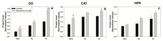 The levels of enzyme proteins: glycolate oxidase (GO) (a), catalase (CAT) (b), and hydroxypyruvate reductase (HPR) (c), in extracts from leaf discs on treatment with MD either normal or high light (1200 µmol m−2 s−1). The ratios of each protein (such as GO, CAT, and HPR) to Rubisco large subunits (loading control) were calculated based on ImageJ software. Each data point is the average of three replicates, and error bars represent ±SE. Asterisks indicate the significance of MD effect compared to the respective control. * p < 0.05; ** p < 0.001.