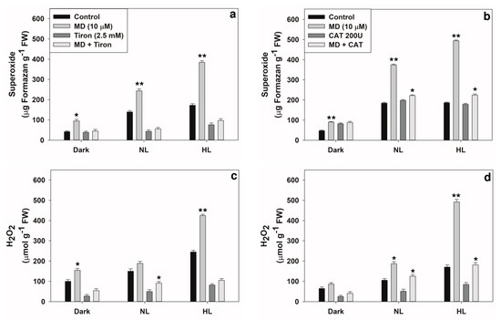 Scavenging ROS, superoxide or H2O2 by Tiron (2.5 mM) or catalase (200 U), respectively, in pea leaf discs after treatment with or without MD. The levels of superoxide (a,b) and H2O2 (c,d) were determined using NBT and DAB, respectively. * p < 0.05; ** p < 0.001.