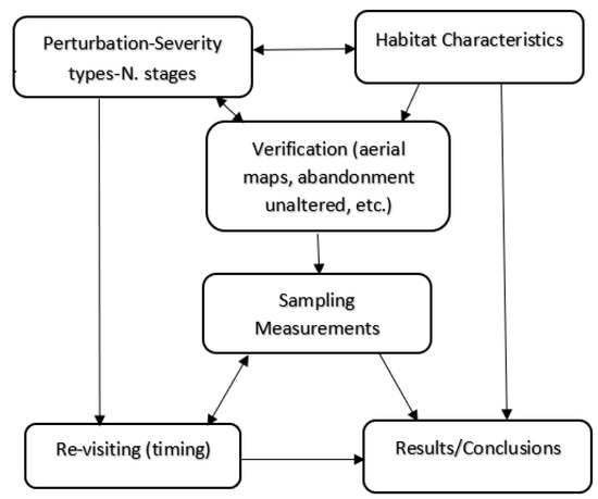 Temporal changes in biotic and abiotic aspects of the soil must be observed, including water availability, nutrients, structure, texture, and biota. Disturbances are responsible for the sudden loss of biomass or structure of an ecosystem but create opportunities for establishment by altering the resources or the physical environment, in addition to initiating and modifying succession. Organisms have complex responses that impact biodiversity [2,166,167,168]. The time scale is important, and influences the interpretation of these previous conditions. Succession is normally studied on a time scale that represents 1–10 times the life expectancy of the dominant species [169]. There are multiple potential trajectories in succession, including single or multiple pathways that can be parallel, convergent, divergent, or cyclical [169]. Convergence occurs due to the reduction in the heterogeneity of the species composition. When the successional trajectories are divergent or non-linear, the chronosequence is less useful and requires more sampling than in parallel or convergent cases. Temporal variables are hard to interpret due to the spatial variability of the soil compounds and their influence on the plant and soil communities. The time and severity of the interventions may be unknown, making it more difficult to establish a chronosequence. Conversely, when these interventions are well documented, the details of their timing and severity can help clarify the trajectory and improve their implementation [124].