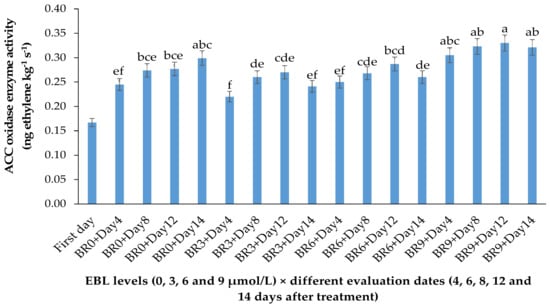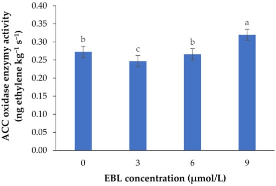 The activity of 1-aminocyclopropane-1-carboxylic acid oxidase (ACO), as the final enzyme in ethylene biosynthesis converting ACC to ethylene, was significantly affected by the BR treatment (p ≤ 0.01) (Table 1 and Figure 1).