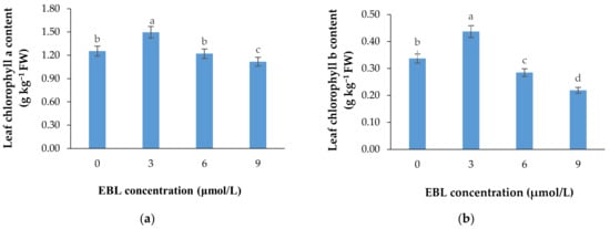 MDA production, as an important indicator of cell membrane integrity status and senescence rate, was significantly (p ≤ 0.01) affected by the EBL treatment (Table 1 and Figure 6a). The MDA production in plants exposed to EBL exhibited different patterns. The MDA production substantially decreased at 3 µmol/L concentration. The MDA production was increased gradually with the increasing level of EBL, and reached the maximum at 9 µmol/L concentration. There was no significant difference between 9 μmol/L EBL and control.