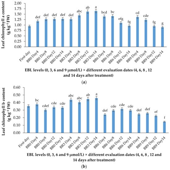 Effect of different concentrations of EBL on chlorophylls a (a) and b (b) content of lisianthus flower leaves at different evaluation dates. Error bars represent the standard error of means of four replicates. Columns indicated by different letters are significantly different according to Duncan’s multiple range test (p ≤ 0.01). The first day is the harvest time of samples.