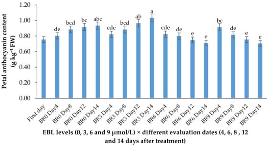 Effect of EBL on anthocyanin content of lisianthus flowers at different evaluation dates. Error bars represent the standard error of means of four replicates. Columns indicated by different letters are significantly different according to Duncan’s multiple range test (p ≤ 0.01). The first day is the harvest time of samples.