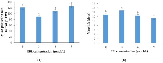 Flowers treated with 3 µmol/L EBL showed a significantly (p ≤ 0.01) higher vase life than the control and the flowers treated with 6 and 9 µmol/L EBL (Table 1 and Figure 6b). The vase life of flowers treated with 9 µmol/L EBL was significantly (p ≤ 0.01) lower than the control, indicating the adverse effects of higher BR concentrations on cell senescence rate and flower vase life.