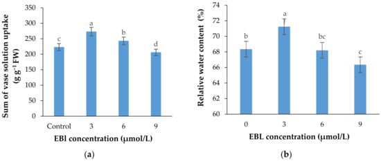 The relative water content of the flowers was significantly (p ≤ 0.01) affected by the treatments (Table 1, Figure 7b). The highest and lowest relative water contents were recorded in flowers treated with 3 and 9 µmol/L EBL, respectively. The difference between the control and 6 µmol/L EBL was not statistically different.