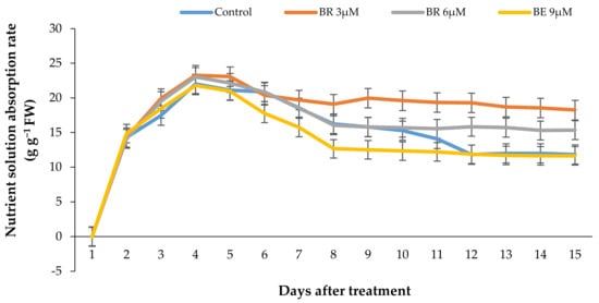 Effect of different EBL concentrations on the vase solution absorption pattern in lisianthus cut flowers in response to the EBL treatment during 15 days of keeping at room temperature. Error bars represent the standard error of means of four replicates.