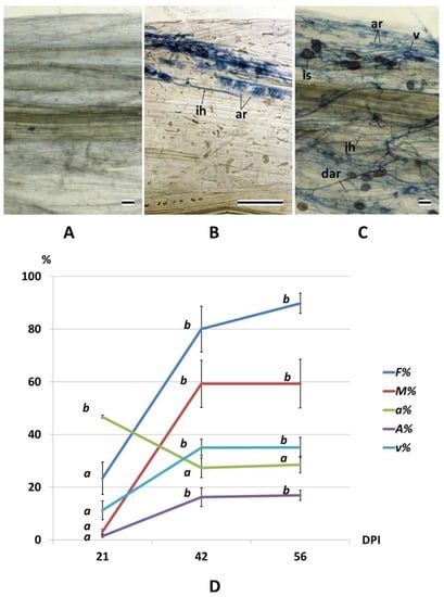 Arbuscular mycorrhiza (AM) development by R. irregularis in cleared pea cv. Finale secondary roots stained with Sheaffer Black Ink. (A) Root fragment of a non-inoculated plant. (B,C) Intraradical mycelium patterns most characteristic of various stages of AM development. (B) The stage of intensive functioning of arbuscules and the exchange of metabolites between the fungus and the plant (most typical for the time point 21 DPI in this experiment). (C) The stage of formation of storage and reproductive organs (vesicles and spores) (most typical for the time point 42 and 56 DPI in this experiment). ih, intercellular hypha; ar, arbuscule; dar, degrading arbuscule; v, vesicle; and is, intraradical spore. Scale bar, 50 μm. (D) Quantitative characteristics of AM development in the inoculated plants: F% is the frequency of mycorrhizal colonization, M% is the intensity of intraradical mycelium development, a% is the arbuscule abundance in mycorrhizal root fragments, A% is the saturation of the root system with arbuscules, and v% is the vesicle and spore abundance in mycorrhizal root fragments. The values for each parameter, which are not significantly different from each other (p ≤ 0.05), are marked with the same letter. Error bars represent standard errors.